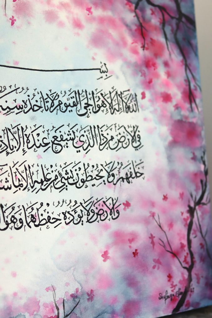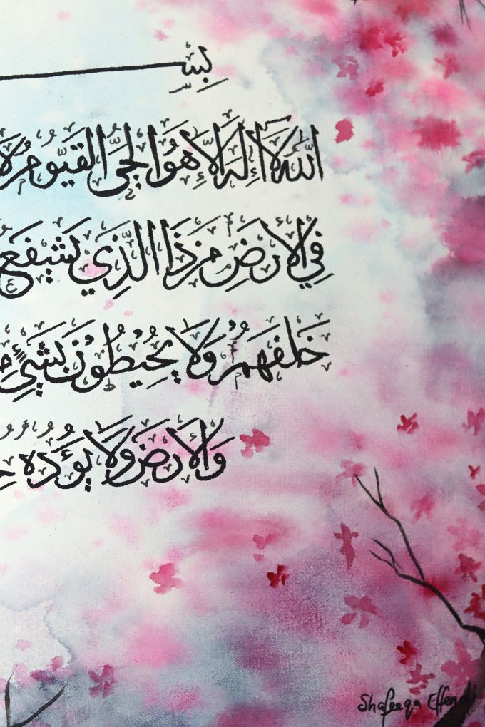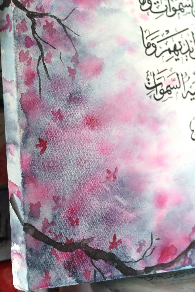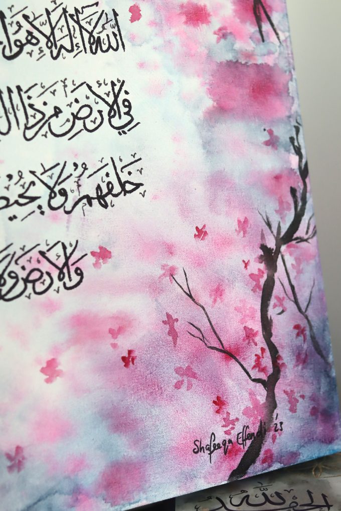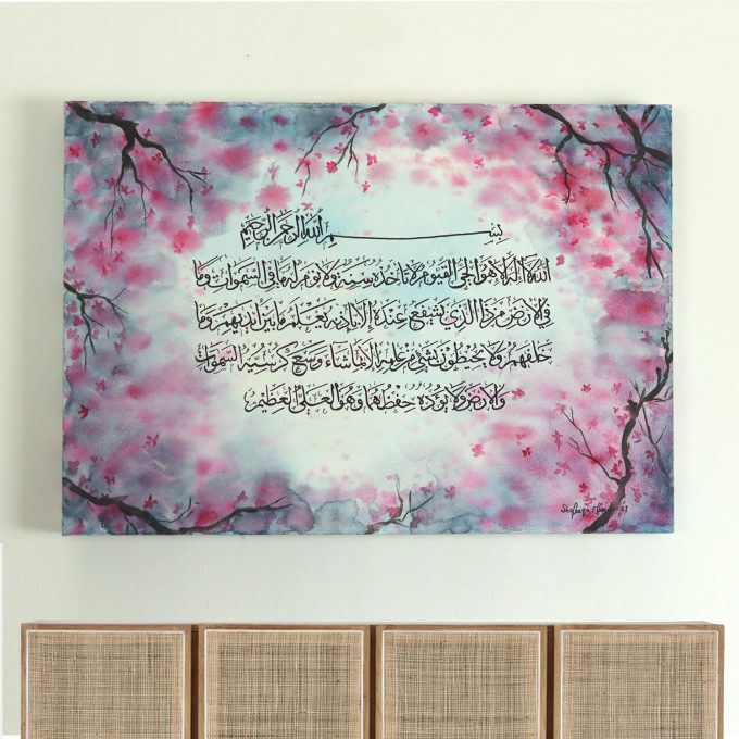 The Ayatul Kursi with soft shades of loose pink blossoms against a dreamy grey sky, creating a feeling of tranquility and happiness in your space. A1 in size.