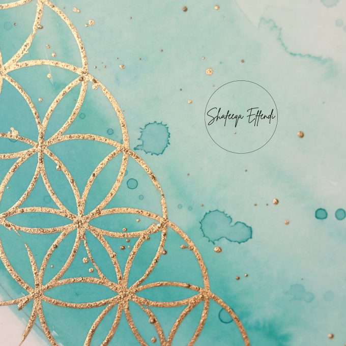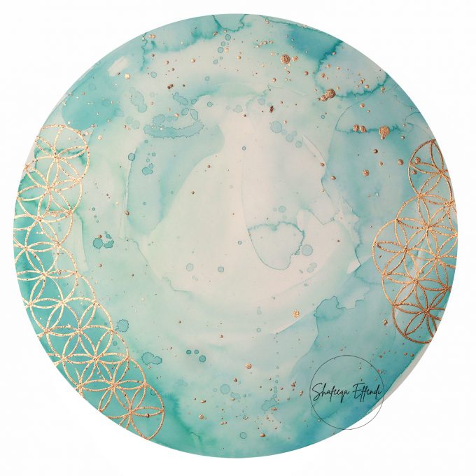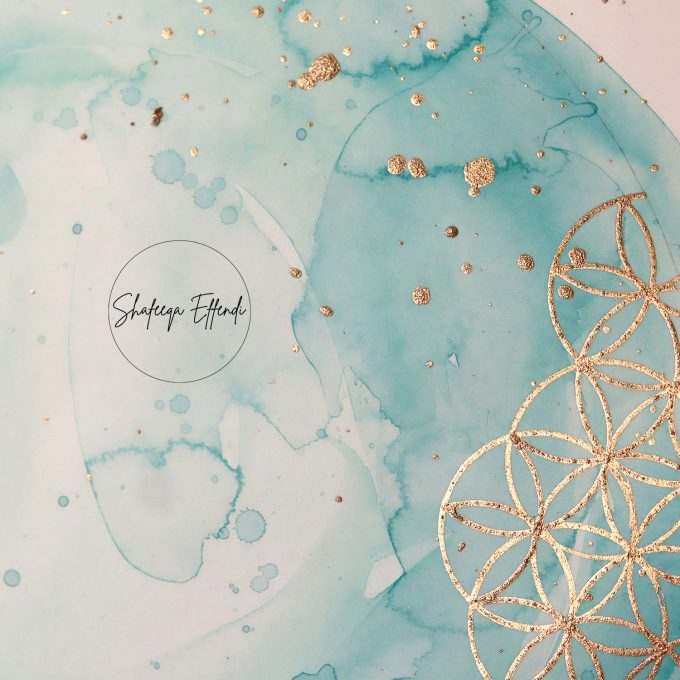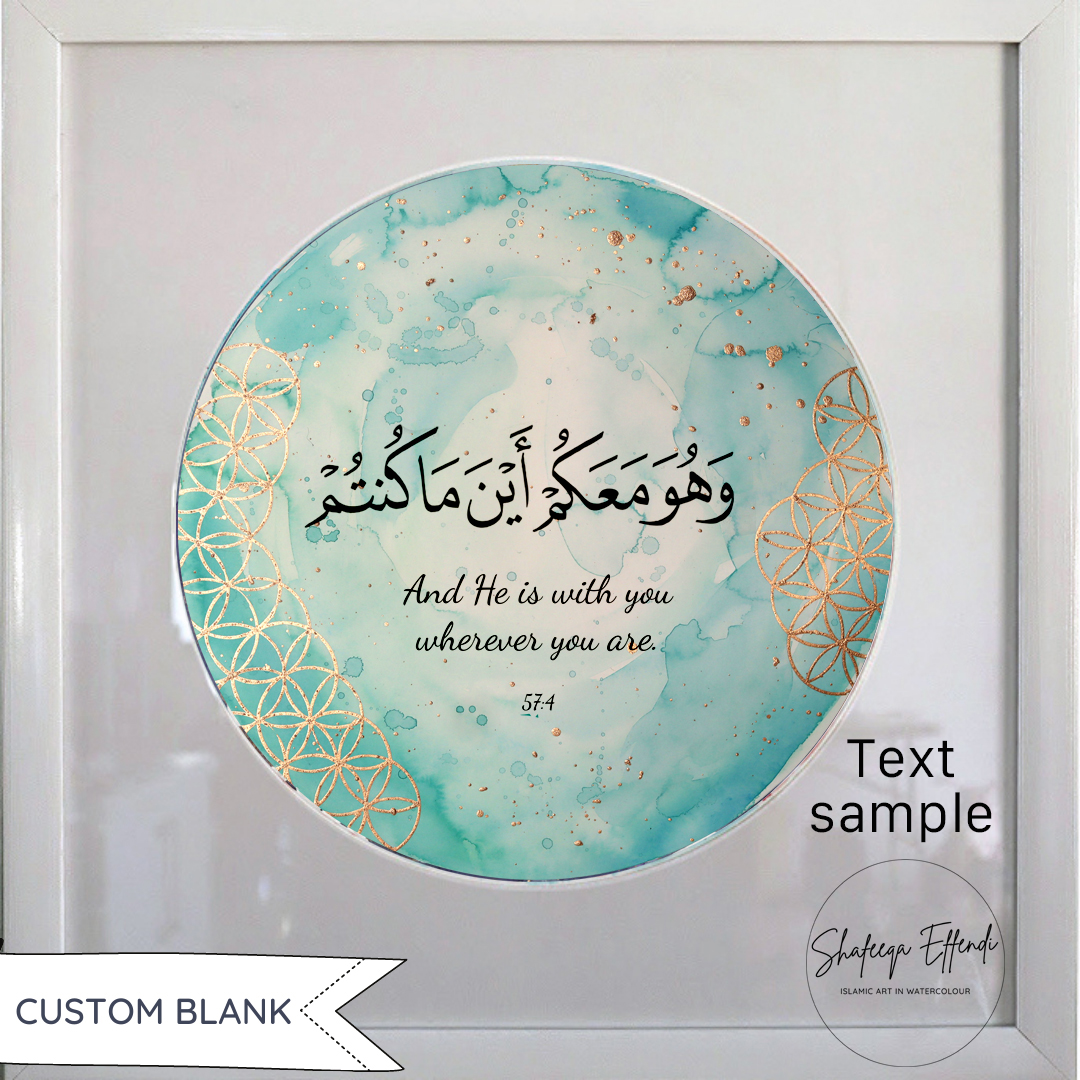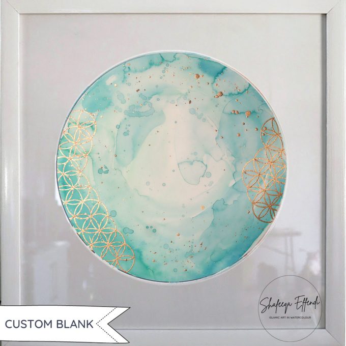 A Custom Blank painting with aqua and turquoise watercolour washes and gold geometric pattern, perfect for adding your own text.